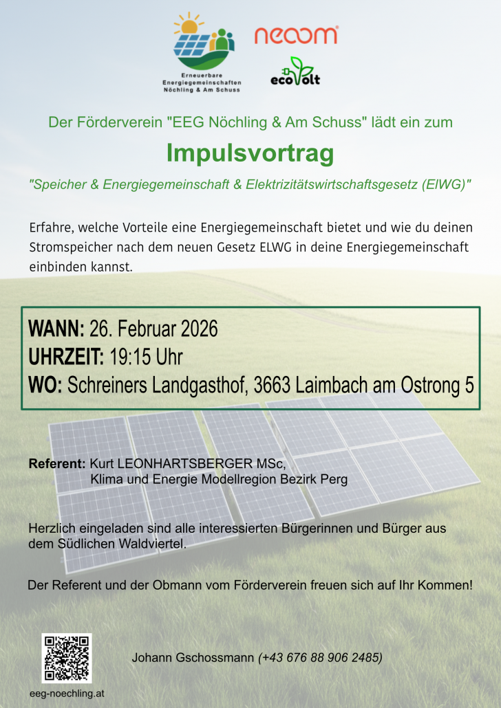 Für seine zahlreichen Maßnahmen und Projekten zur Förderung erneuerbarer Energien wie z. B. die Gründung der Erneuerbare Energiegemeinschaft (EEG) Nöchling sowie der EEG Am Schuss wurde Hans Gschossmann mit dem Ehrenamtspreis für Nachhaltigkeit ausgezeichnet. Durch sein Engagement haben viele ansässige Vereine die Möglichkeit, gemeinsam sauberen Strom vor Ort zu produzieren und zu fairen Preisen zu konsumieren.